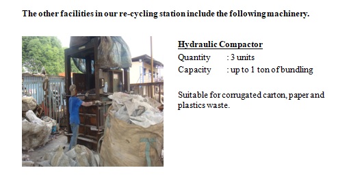 Following the Malaysian government urge to promote re-cycling of waste and preserve the environment, we have established a facility to serve for re-cycling purpose. A property of approximately 1.50 acres was developed to facilitate our re-cycling programme.