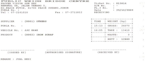 Proven Vision Sdn Bhd Weighbridge Weighbridge at Warehouse 120,000 Tons Capacity – 1 unit Weighbridge 30,000 Tons Capacity – 1 unit Weighbridge Ticket